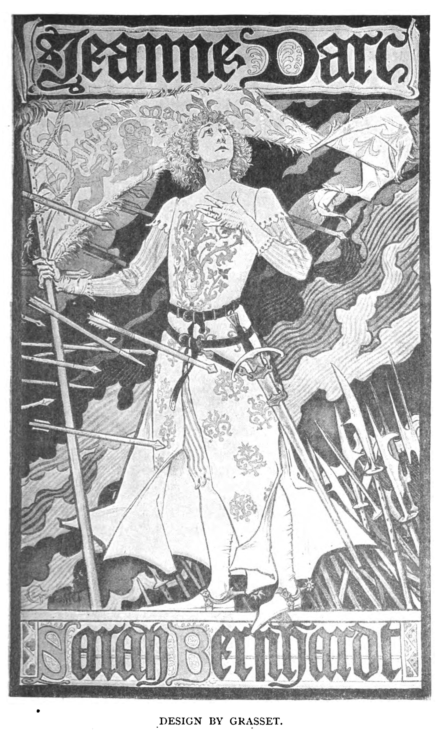 To turn from Chéret to Eugène Grasset, is to turn to an artist in whose art career the poster is merely an incident. Grasset is a paragon of versatility; there are literally no bounds to his comprehensiveness. Besides being a painter of distinction, he has designed everything, from stained glass to book-covers, from piano-cases to menus. Unlike Chéret, he has been profoundly impressed by the work of old decorative designers; he has certainly not disdained to borrow; his borrowings, however, have been at once legitimate and intelligent. The Japanese, the old Italians, and in a less degree, the ancient Greeks, have been laid under contribution, with results which, if not amazingly original, are at least delightful. It would be idle to pretend that, from the standpoint of the advertiser, Grasset is the equal of Chéret. His sense of beauty, his passion for decoration, make it impossible for him to achieve the daring and victorious colour which is so effective in the work of Chéret. A panel of his posters, side by side with a panel of those of Chéret, is as a beautiful and somewhat quiet-hued wall-paper to a cascade of flowers of every conceivable colour. While, however, this is an important matter from the advertiser's point of view, it is of little moment to the collector, whose primary object is to fill his portfolios with things of beauty. At times, indeed, Grasset does achieve irresistible advertisement; nobody, for instance, could overlook the superb representation of Sarah Bernharct as "Jeanne d'Arc," standing with splendid disdain amidst a forest of spears