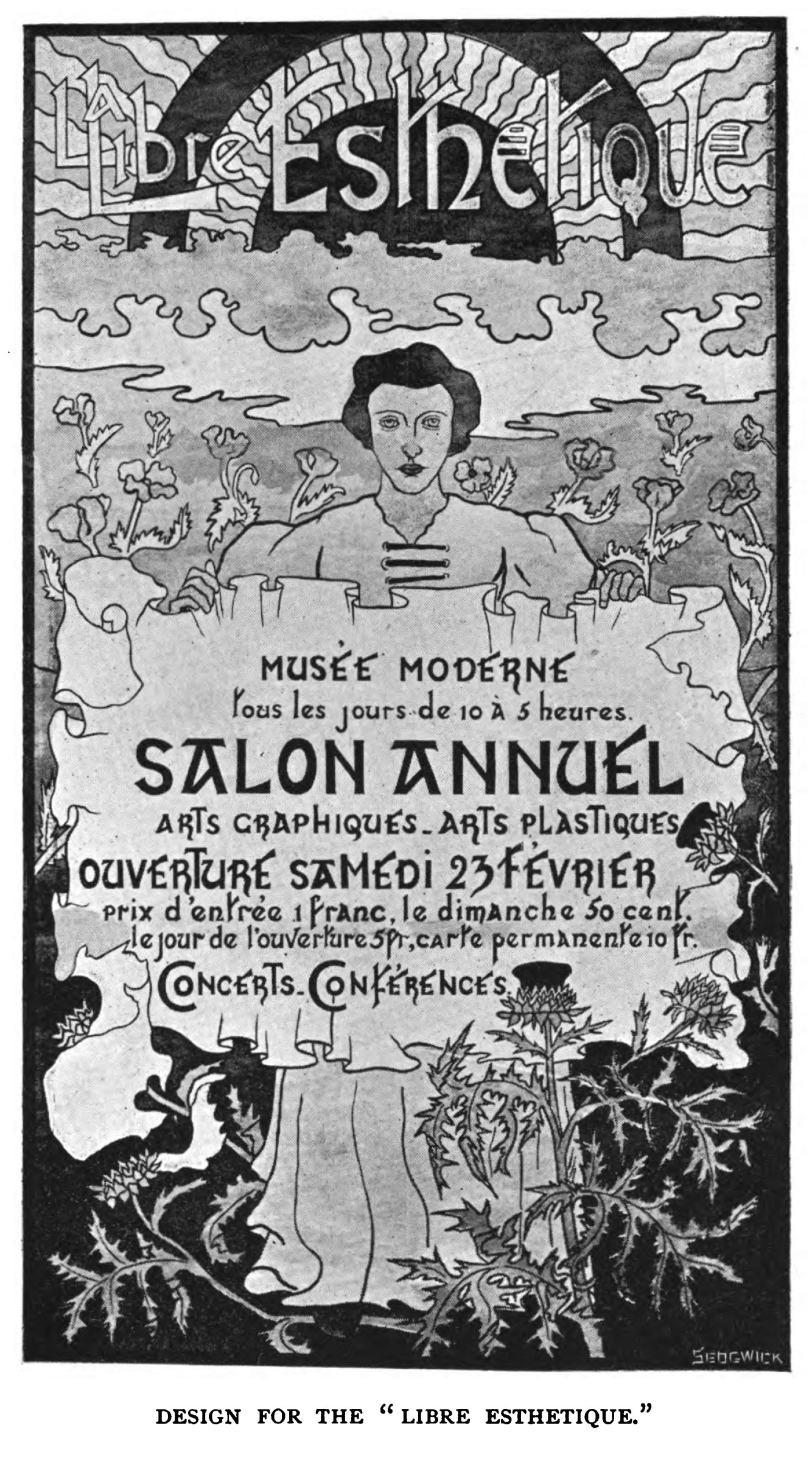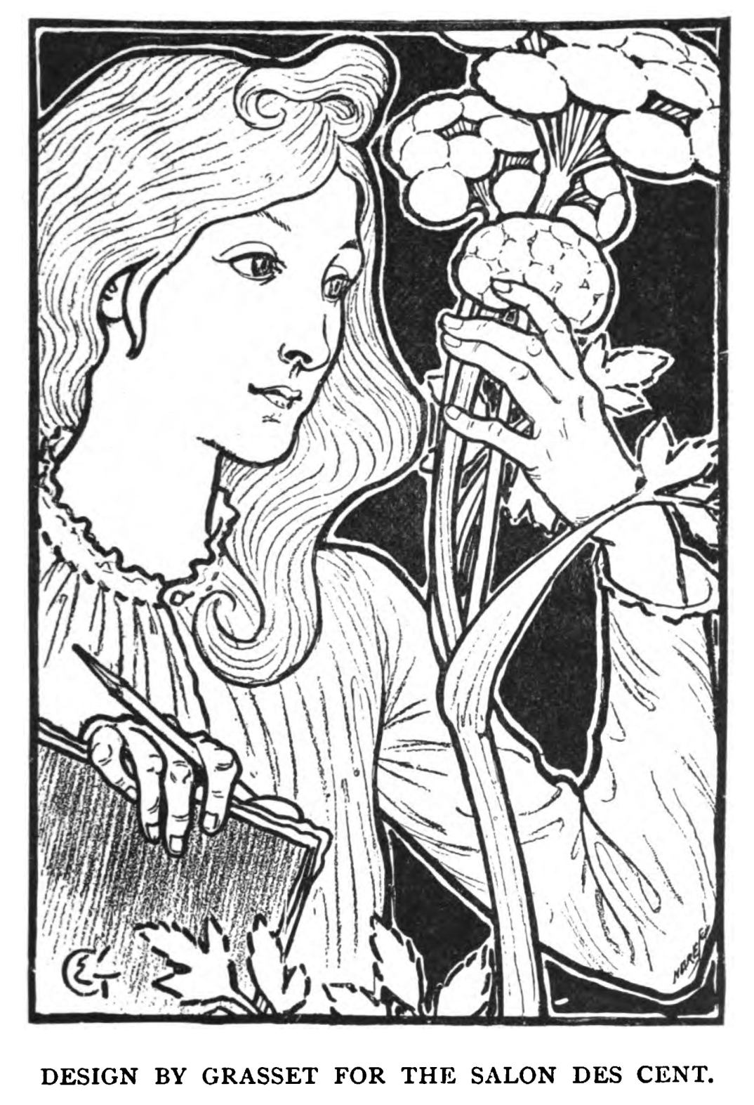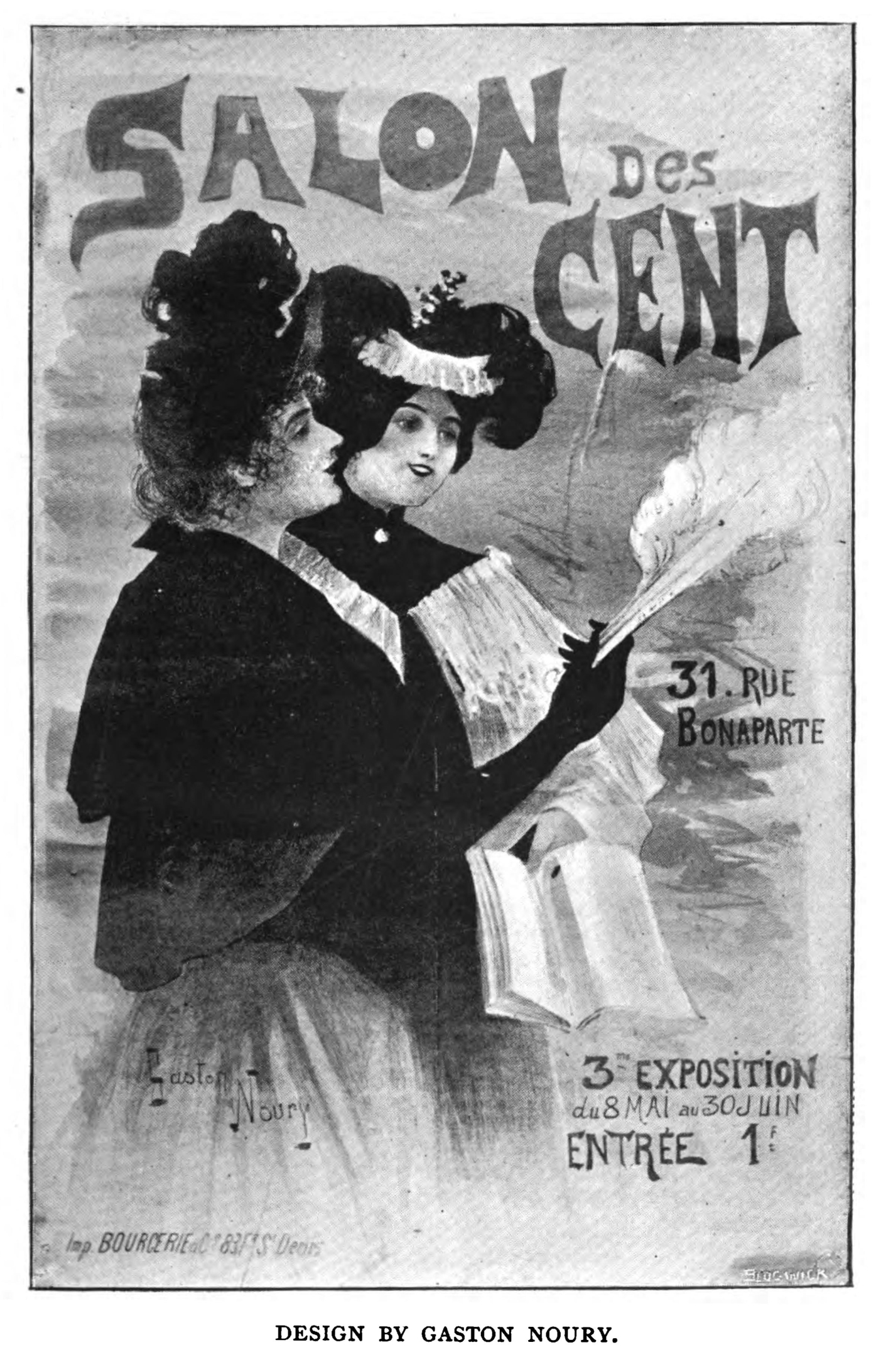 fine decorative qualities. Of an entirely different kind is the delicious little poster which the artist did for an exhibition of his own work at the Salon des Cent in 1894; in the naïve simplicity of the thing, combined with its fine decorative quality, there is a hint of Botticelli and the old Italians. The contrast between this poster, slightly archaic as it is, and the realistic "Odéon Théâtre" is complete. The latter represents a charmingly graceful girl, in a delicious modern gown, watching a play. She is accompanied by a highly-proper looking matron, whose self-importance is enhanced by the possession of a handsome dress and a wealth of jewels. Very pretty, again, is the "Librairie Romantique," with the façade of Nôtre Dame in the background. Less worthy of Grasset is the "A la Place Clichy," which, in spite of the majestic old oriental who descants on the merits of an elaborate carpet to a critical European, is somewhat commonplace. Among the other productions of this artist, some of them excellent, but not calling for special description, are the "Histoire de France," "Napoléon," "Chocolat Mexicain," and "L'Encre Marquet," as well as those done to advertise a work on the capital cities of the world, and the exhibition of the productions of French decorative artists held in 1893 at the Grafton Gallery. A bill designed for the South of France Railway Company is curious, insomuch as it is unlike the other productions of its designer. It consists of a series of pleasant little landscapes wreathed in the characteristic fruits and flowers of the Riviera. The colour is striking and the