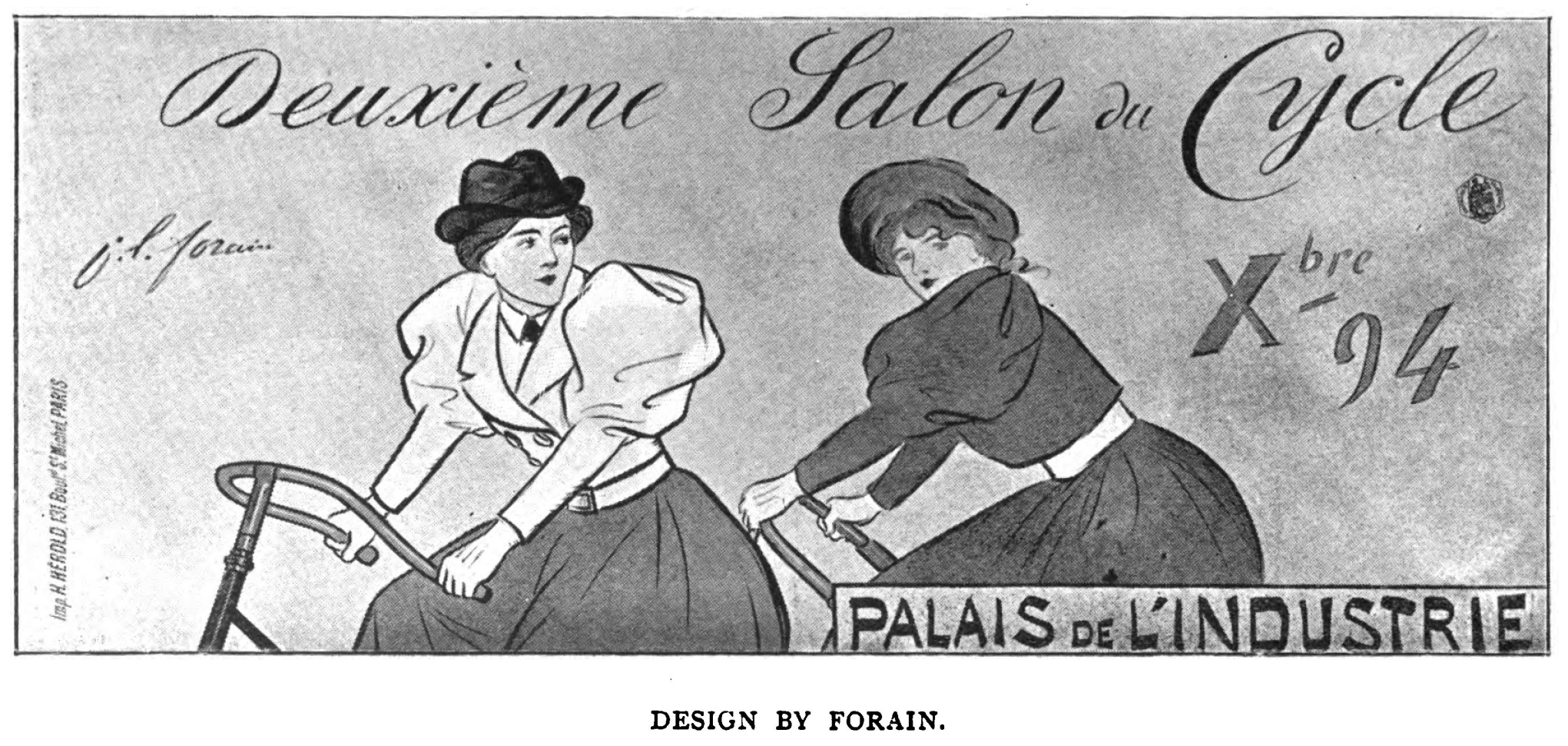 Few, if any, can approach him in technical dexterity, few can express so much in so few lines. Moreover, to his technical mastery is added a searching power of criticism which gives to his work a further, and a most important, interest. In his desire to depict the truth, the whole truth, and nothing but the truth, he (no doubt unconsciously) becomes a moralist. He depicts life from no sentimental point of view; he can be realistic without seeming to appreciate the tragedy which is of the very essence of realism, so that on seeing one of his illustrations of modern life, one receives, apart from technical delight, a distinctly literary impression. Of his posters, perhaps the earliest is one unsigned and without lettering, representing an illuminated garden, in which a woman is depicted in the midst of an explosion of fireworks. Subsequent to this comes a bill to advertise one of the novels of Dubut de Laforest, which bears the artist's signature. The design which announces Forain's political drawings for the "Figaro" is of slight importance, as it was not originally intended for a poster. In spite of this it is by no means easy to meet with. Of greater interest is the "Exposition des Arts de la Femme." It was, however, only when Forain received a commission to produce an illustrated advertisement for a cycle show that he achieved a really memorable poster, a poster of real charm and rare