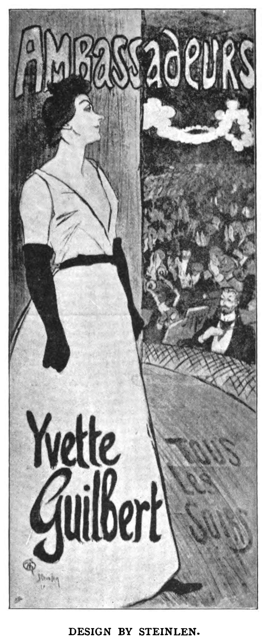 The somewhat risky pages of the Gil Bias Illustré have for a considerable time been noticeable to artists, chiefly on account of a series of coloured illustrations by Steinlen. His relentless veracity in depicting the life of the lower classes of the Paris of to-day is almost without rival. No detail of squalor seems to escape him; without a tinge of remorse he proceeds to inform us of the meanest incidents in the tragedy of the poor or vicious quarters of the great city. By reason of a certain emphasis of colour and crudeness of design the art of Steinlen is admirably adapted to the production of such human documents. But it cannot be maintained that, whatever their technical merits, these studies of human misery are other than unpleasant-even painful. It is, therefore, altogether agreeable, when one turns to his essays in the art of the poster, to find his work graceful rather than tragic, urbane rather than mordant. Forsaking his mission of realistic illustration, he becomes gay, dainty, and fanciful as the best of his fellows. Even in a higher degree than the majority of them, he makes his design appropriate to the thing advertised. His decorations are spiced with a certain actuality, and, in being so, insist more effectively on the particular article the merits of which it is their business to proclaim. No better example of this could, I think, be put forward than the "Lait pur de la Vingeannestérilisé," a design which, in view of the material to be advertised, is conceived in the happiest vein. The pretty little girl drinking the milk, so much coveted of the cats which surround her, is less interesting than the animals themselves. The draughtsmanship of the latter is excellent, while there is a hint of that humanity of expression about the creatures which has produced for the work of Landseer so immense a popularity. Not less admirable, and of still greater interest, is the poster designed to advertise the performances of Yvette Guilbert at the Ambassadeurs. Amongst the numerous artists to whom the Sarah Bernharct of the music-halls has given commissions none has been more successful than Steinlen. The poster represents the singer behind the footlights in an attitude pre-eminently characteristic. The thing does not amount to a caricature, as does the hitherto unpublished delineation of Toulouse-Lautrec, but is merely a slightly exaggerated portrait. It is remarkably suggestive of a most alluring and delightful