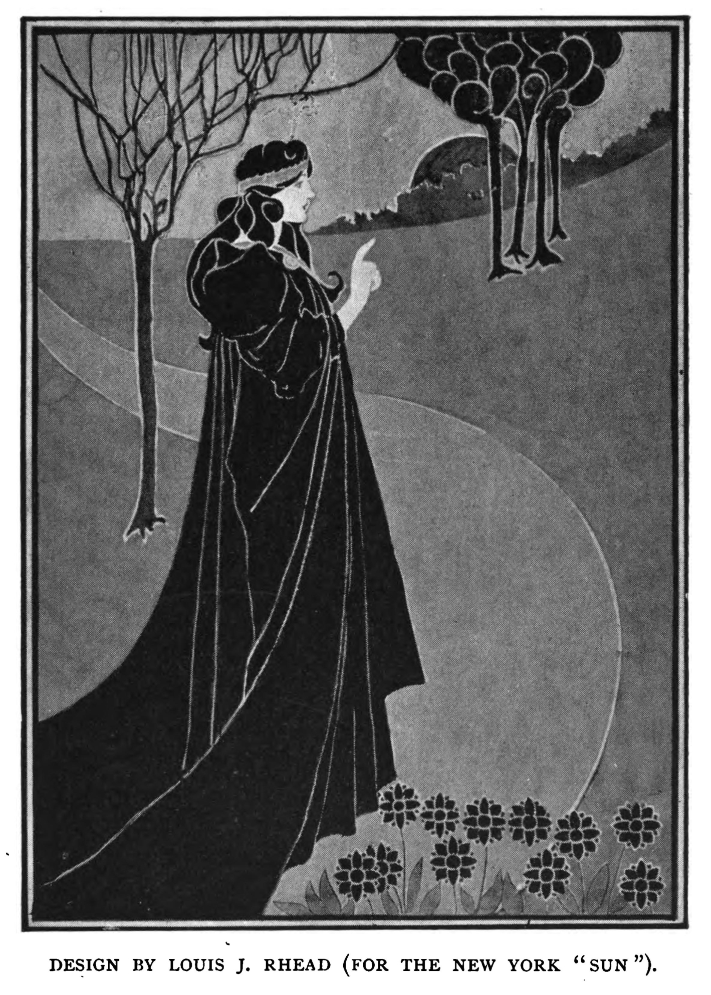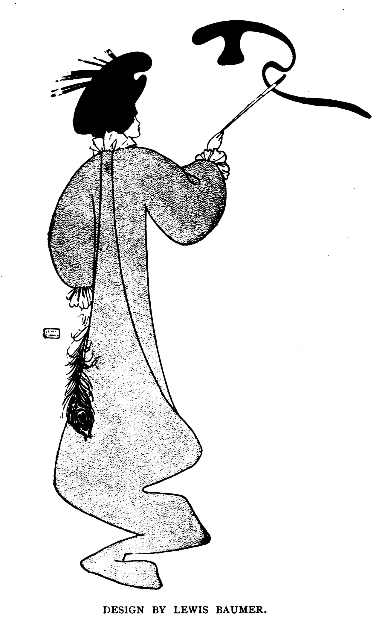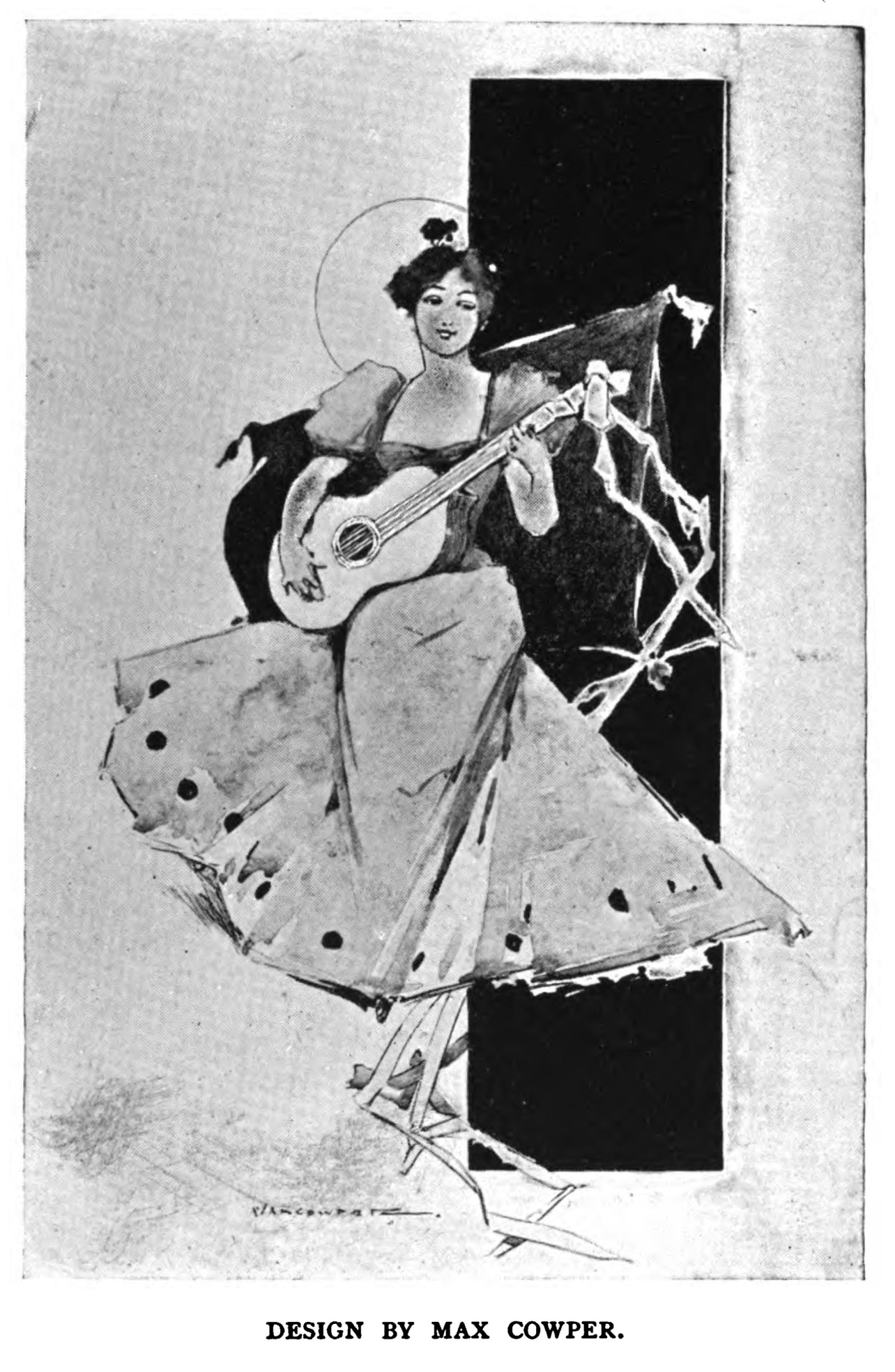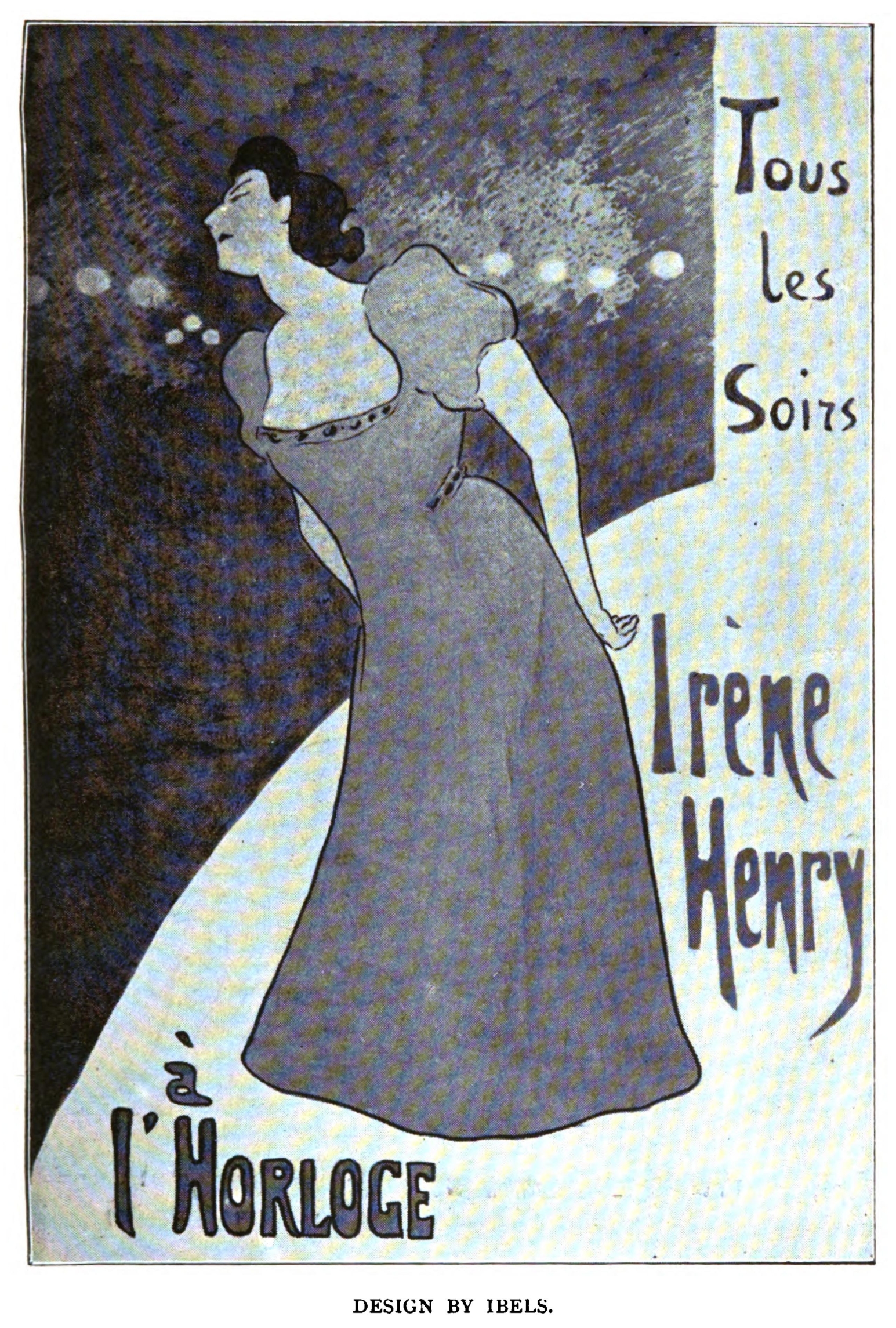 For the Paris café chantant artiste who possesses the charming name of Jane Avril, this designer has devised a grotesque decoration, which could not fail imperiously to call attention to her talents as a dancer. Inspired it may be by her name, it may be