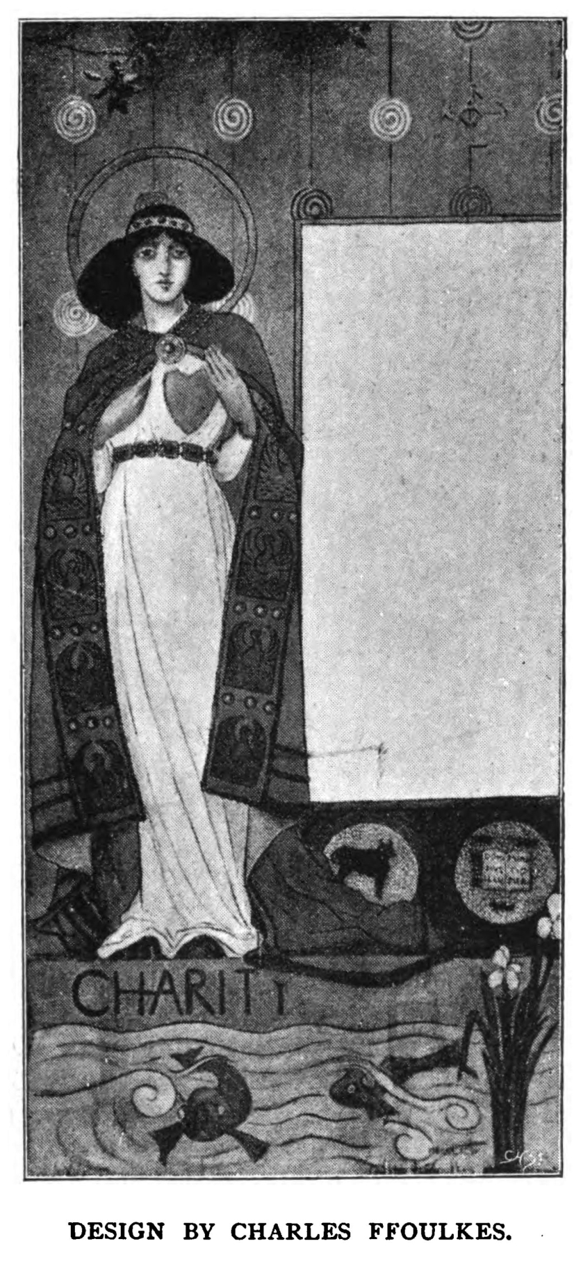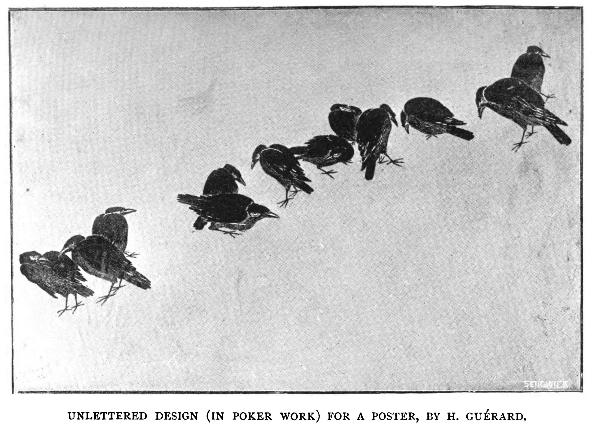 It is not for a moment to be pretended that the artists with whom this chapter deals are in any sense members of a single school: they have, indeed, many more points of difference than of similarity. I deal with them together, because, speaking roughly, their designs are saturated with the spirit of the day: their decorations are realistic, rather than fantastic or picturesque. They lean towards Lautrec, rather than towards Chéret or Grasset, but they are in no sense his imitators; some of them, indeed, are actually his predecessors.