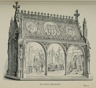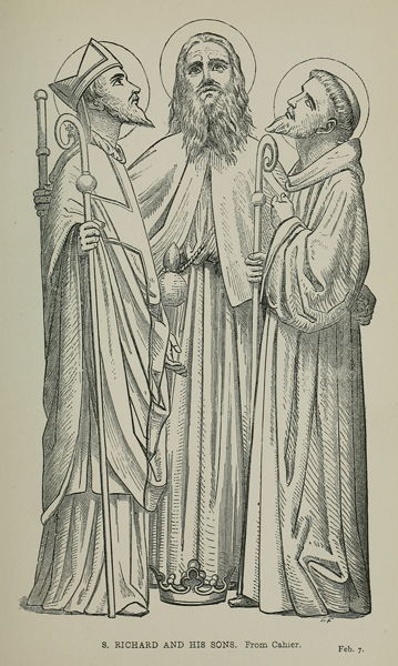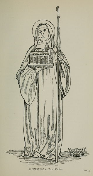 The blessed Walburga was a daughter of S. Richard, West Saxon Thane, (Feb. 7th), and sister of S. Willibald, (July 7th), and S. Wunnibald, (December 18th). {415} These holy brothers accompanied their uncle, the great S. Boniface, (June 5th), apostle of Germany, on his mission, and are regarded and honoured as his fellow apostles. S. Walburga was educated from early childhood in the monastic calm of Wimbourne, in Dorsetshire, where she took the veil, and spent an untroubled youth till called by S. Boniface to Germany. Boniface had asked his kinswoman, the abbess Tatta, to send him a colony of nuns to found a religious house in the newly acquired provinces of the kingdom of Christ. She sent S. Lioba, with several under her, amongst whom was S. Walburga, and they settled at first at Bischofsheim, in the diocese of Mainz. Two years after she was appointed abbess of Heidenheim, a religious house founded by her brothers, Willibald, bishop of Eichstadt, and Wunnibald, who ruled an abbey of men. So great was her prudence and virtue, that on the death of Wunnibald, in 760, following the Anglo-Saxon precedent, Walburga was appointed to superintend the abbey of monks, as well as her own convent of nuns, and this double charge she executed till her death. S. Willibald translated the body of his brother to Eichstadt, in 776; and S. Walburga was present at the ceremony. She died in 779 or 780, but on what day is not mentioned by her biographer.