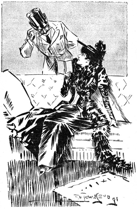 It was a brilliant scene. The apartments of the Old Maids' Club had been artistically decked with the most gorgeous flowers that the millionaire could afford, and the epigrams had been carefully removed so as to leave the rooms free for dancing. As Lillie's father gazed around, he felt that not many millionaires could secure such a galaxy of beauty as circled in the giddy dance in his gilded saloon. It was, indeed, an unexampled gathering of pretty girls—this inaugural soirée of the Old Maids' Club, and the millionaire's shirt-front heaved with pride and pleasure and the Letter-Day Cupid that still hung on the wall seemed to take heart of grace again.
