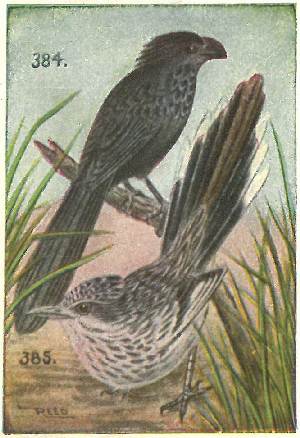 Anis are fairly abundant in southern Texas along the Rio Grande. Like all the members of the family of Cuckoos, their nesting habits are very irregular; ofttimes a number of them will unite and form one large nest in a bush, in which all deposit their eggs. The eggs are bluish-green, covered with a white chalky deposit (1.25 × .95).