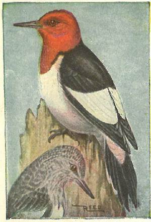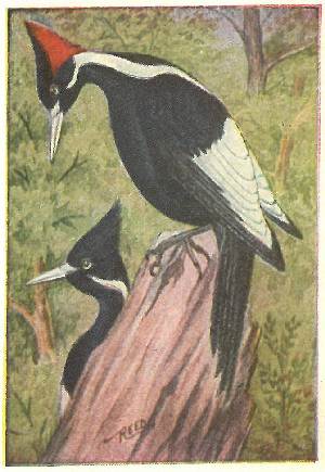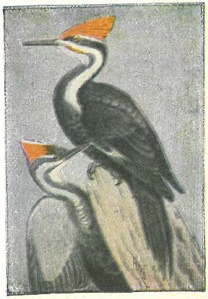 These are the largest and most rare of the Woodpeckers found within our borders. Their decline in numbers is due, to a certain extent, to the killing of them because of their size and beauty, but chiefly on account of cutting off of a great deal of the heavy timber where they nest. They are very powerful birds and often scale the bark off the greater portion of a tree in search for insects and grubs, while they will bore into the heart of a living tree to make their home.