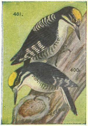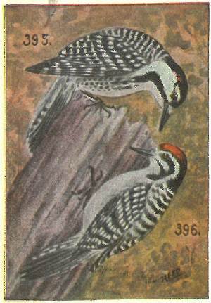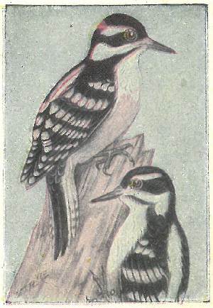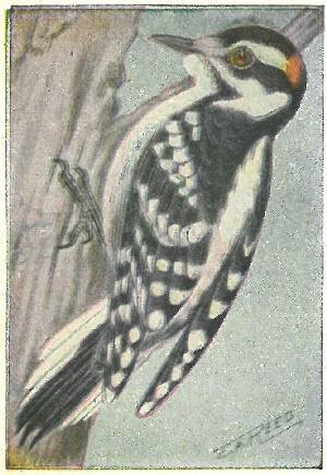 The male has a red nuchal patch while the female has none. Downies are one of the commonest of our Woodpeckers and are usually tame, allowing a very close approach before flying. They remain in orchards and open woods throughout the summer, and in winter often come to the windows in places where they are fed, as many people are in the habit of doing now. Their food, as does that of nearly all the Woodpeckers, consists entirely of insects, grubs and larvæ.