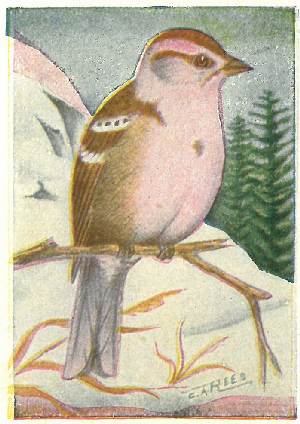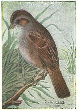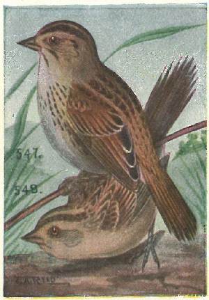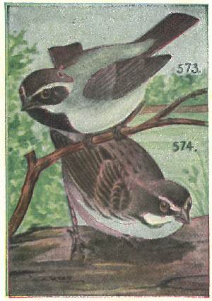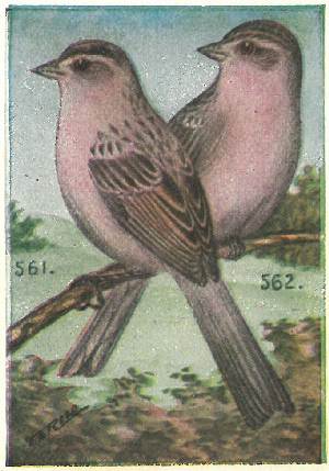 Many rare and interesting poses are faithfully shown by the camera. For instance, a pair of adult Chipping Sparrows, standing on a branch by the sides of their four young, are engaged in pulling apart a large worm that was too large to be given whole.