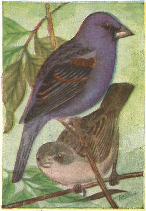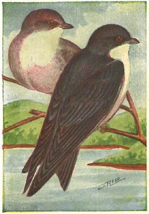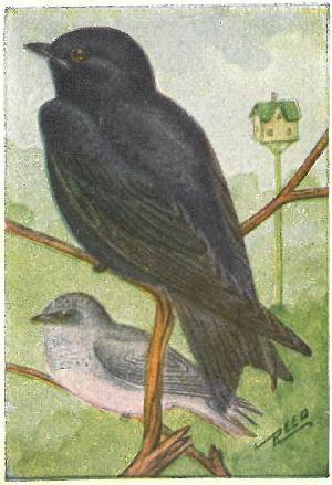 A house for Purple Martins may contain many apartments; it should be erected in an open space, on a ten or twelve foot pole. Boxes for other birds should have but one compartment, and should be about six by six by eight inches, with a hole at least one and one-half inches in diameter in one side; these can be fastened in trees or on the sides or cornices of barns or sheds. It is needless to say that English Sparrows should not be allowed to use these boxes. By tying suet to limbs of trees in winter, and providing a small board upon which grain, crumbs, etc., may be sprinkled, large numbers of winter birds may be fed; of these, probably only the Chickadees will remain to nest, if they can find a suitable place.