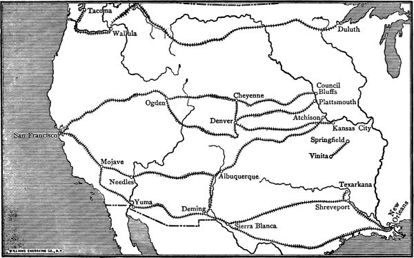 A third connection of the Southern Pacific across Texas was operated before the end of 1883 over its Mojave extension in California and the Atlantic and Pacific from the Needles to Albuquerque. The old Atlantic and Pacific had built to Vinita, gone into receivership, and come out as St. Louis and San Francisco. But its land grant had remained unused, while the Atchison, Topeka, and Santa Fé had reached Albuquerque and had exhausted its own land grant, received through the state of Kansas and ceasing at the Colorado line. Entering Colorado, the latter had passed by Las Animas and thrown a branch along the old Santa Fé trail to Santa Fé and Albuquerque. Here it came to an agreement with the St. Louis and San Francisco, by which the two roads were to build jointly under the Atlantic and Pacific franchise, from Albuquerque into California. They built rapidly; but the Southern Pacific, not relishing a rival in its state, had made use of its charter privilege to meet the new road on the eastern boundary of California. Hence its Mojave branch was waiting382 at the Needles when the Atlantic and Pacific arrived there; and the latter built no farther. Upon the completion of bridges over the Colorado and Rio Grande this third eastern connection of the Southern Pacific was completed so that Pullman cars were running through into St. Louis on October 21, 1883.