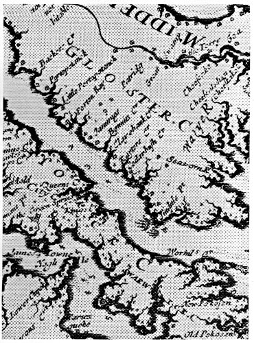 The only extant map that shows both Clay Bank Creek and Bennit's Creek is the Augustine Herman map of Virginia and Maryland published in 1673 (fig. 1). But this shows Bennit's Creek as being as long as the present Jones' Creek, while the latter is omitted from the map altogether. However, as the parish records delineating the bounds of the precincts in 1709 refer to both Bennit's Creek and Jones' Creek there cannot have been any confusion between them. It is therefore reasonably well established that the Porteus property lay between those creeks, which would place it north of the modern community of Clay Bank and south of Jones' Creek. Although it has not been proved that the Porteus land included the York River frontage, it is reasonable to suppose that it did. Thus, if that conjecture is accepted, it becomes highly probable that the present "Ardudwy" and the adjacent early foundation are on what were once Porteus acres.[4] The Porteus family continued to own this or other land in the Second Precinct until at least 1763 as the bounds of that precinct were ordered to be processioned in 1751, 1755, 1759 and 1763 beginning "on the Land of Robt Porteus Esqr."[5] As Robert Porteus never returned to Virginia after 1727 and died in 1758, it must either be assumed that the plantation was taken over by a son or that it was operated by a tenant or manager on "Capt." Robert Porteus' behalf. In the absence of any other documentation indicating the presence of any members of the Porteus family in Gloucester after October 1725,[6] the latter construction seems most reasonable. The continuing references to Robert Porteus' land in the Second Precinct until 1763 may be explained as referring to the estate of the late Robert Porteus.