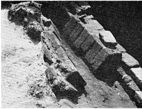 A curious and still unexplained feature of the underhearth was a 4-by 3-inch channel running across the top of the surviving foundation for a distance of 6 feet 9 inches, starting at the south face and terminating 9 inches short of the north. This channel had been bricked over and the remaining bricks had dropped into it (fig. 5) presumably after a wooden beam, which once occupied the space, had rotted or burned out. Traces of burned or carbonized wood lay on the clay bottom of the channel, but the bricks over it displayed no evidence of fire. The only conceivable explanation for the presence of the wood must be that it was part of a frame used to hold the block of natural sandy clay together while the underhearth wall was being erected around it. As the underhearth foundation would have originally risen at least another 2 feet 6 inches above the timber to the floor level of the house, the wood would not have been in danger of igniting from the heat of the domestic fire. But if the house ultimately burned, it is possible that the exposed end of the timber might have caught fire and slowly been consumed along its entire length.