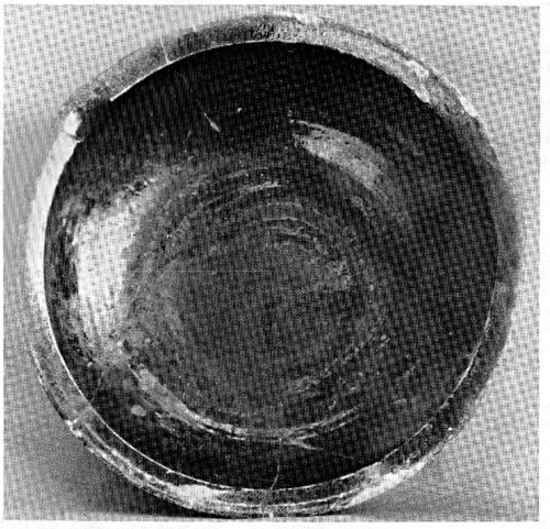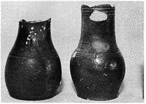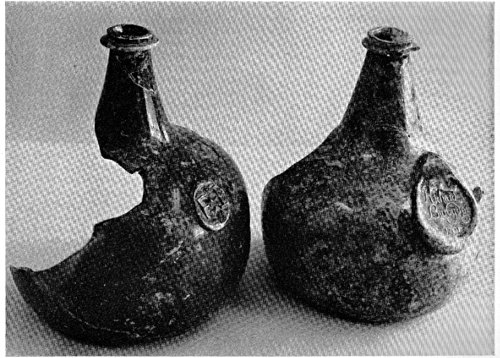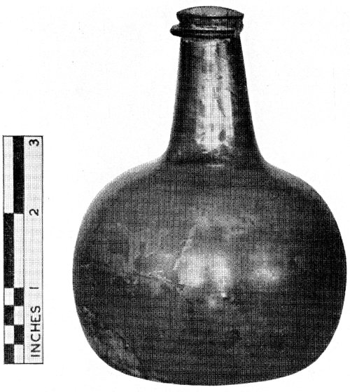 Other glass objects included the powdered remains of a small quatrefoil-stemmed wineglass, a form common in the period 1680-1700.[24] Like so many glasses of its type, the metal was singularly impermanent when buried in the ground, and little or nothing could be salvaged of it. Also present were fragments of at least seven wine bottles of the short-necked, squat-bodied forms of the late 17th century, as well as one fragment of a short-necked and everted-mouthed case bottle. A few fragments of cylindrical pharmaceutical bottles were also found as was a well-preserved bottle of similar metal but in wine-bottle shape (fig. 9 and fig. 15, no. 19). Such bottles are thought to have been used for oils and essences, and their manufacture seems to have been confined to the period about 1680-1720.