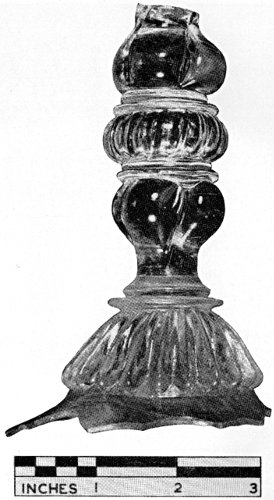 One might be tempted to believe that a glass candlestick would be more likely to have been brought to 17th-century Virginia than would a seemingly pretentious, covered, "ceremonial" drinking-glass. But in 1732, Thomas Jones[22] of Williamsburg made a settlement upon his wife in case of his death, and among the possessions listed were "6 glass decanters, 6 glasses with covers...."[23] Covered glasses ceased to be popular after about 1720 when fashions in glass were turning from the icy sparkle of mass towards more delicate and lighter designs. It is possible, therefore, that the Jones' glass might have been of the general type indicated by the Clay Bank stem. But be this as it may, there is no doubt that the excavated stem is the finest piece of glass of its period yet discovered in America, and that it is sufficiently important to be able to add a paragraph to the history of English glass.