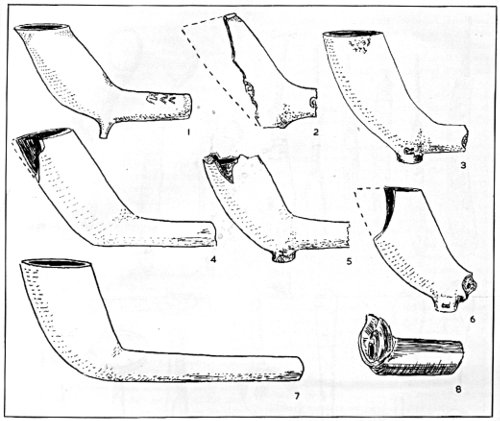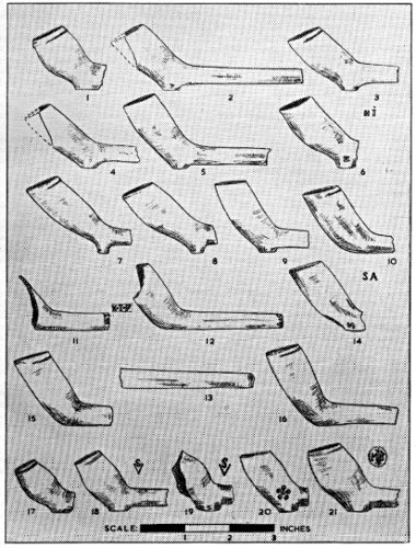 Tobacco-pipe fragments (fig. 16) were plentiful throughout the cellar fill and provided a useful range of bowl forms as well as a key to the dating of the deposit. All the bowls were of types common in the last years of the 17th century, a period in which the two English bowl styles of the second half of the century (one evolving with a spur and the other with a heel) merged together into the single spurred form of the 18th century.[25] In addition, the Clay Bank cellar contained examples of bowls with neither heel nor spur, a style never popular in England, and which seems to have been developed specifically for the American market initially copying the shape favored by the Indians.