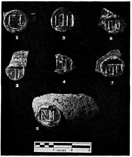 The presence of the same maker's initials, I·F, on pipe bowls at different levels of the cellar fill strongly pointed to a homogeneity of deposition. Although it is impossible to identify the owners of the initials with any certainty, it is worth noting that there was a Josiah Fox making pipes in Newcastle-under-Lyme in and after 1683 whose initials are the same as those most common in the Clay Bank cellar. The I·F mark was somewhat unusual in that it was impressed between two X's across the top of the stem (fig. 16, no. 11). All other marks, save one, were in the normal position, to left and right of the heels. These comprised W F (William Ferry, Marlborough, about 1700?), or perhaps W.P., II I (Henry Jones, London, 1688?)[29] and V R. The remaining mark, S A (fig. 16, no. 14) occurred on the bases of two bowls with neither heels nor spurs. From the oystershell layer south of the existing house came a bowl fragment ornamented with the name of a well-known Bristol pipe-making family, I TIPPET, in a raised cartouche on the side. This was probably Jacob Tippett whose name appeared in the Bristol Freedom Rolls in 1680.[30]