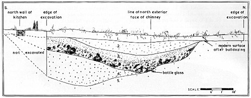The filling of the cellar in the vicinity of the chimney and underhearth comprised a single massive deposit of sandy clay, scattered through which were numerous iron nails, isolated oystershells and occasional fragments of pottery, glass, and tobacco-pipe stems. A similar unified filling was encountered at the western end of the excavation, but towards the middle a large and irregular deposit of oystershells was sealed within the sand at a depth of 4 feet 6 inches sloping upward to 3 feet 6 inches towards the south wall. The shell layer averaged from 6 to 9 inches in thickness and was found to contain many of the more important artifacts.
