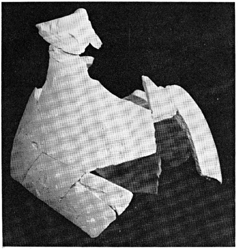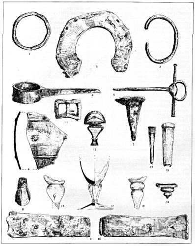 Owing to a shortage of labor and the rigors of the weather, it was necessary to confine the digging to small areas which could be completed in a single day's work. Consequently, it was not possible to clear the whole area, as one part would be back-filled during the digging of the next. Mr. and Mrs. Jenkins, the owners of the property, were extremely tolerant of the damage that was done to their gardens, but after the clearance of the large area E, they indicated that the project had gone far enough. Nevertheless, they were persuaded to permit the cutting of another smaller test area to the west (F), but when this, too, failed to find the westerly extremity of the cellar, the project was abandoned. Subsequently, relatives of the owners cut into the exposed north face of area E and extracted a number of potsherds and other fragmentary objects from the sand filling.[18] The undercutting of the bank extended to a distance of 1 foot 6 inches without encountering the north edge of the cellar, thus showing that the total width was in excess of 14 feet.