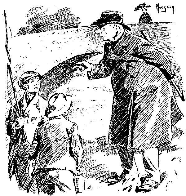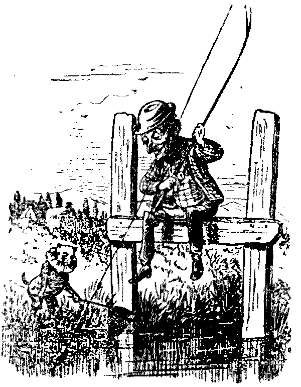 As a fisherman Mr. Punch is in the best of his humours. He makes merry over the weaknesses of those who follow the craft of Old Izaak, always with the slyest of genial manners. The angler's habit of exaggerating the size of his catch—his patience or his impatience when the fish won't bite—the conscious or unconscious ridicule he has to endure from onlookers when he is unsuccessful—the proverbial thirst that attacks the fisherman, whether he catches anything or not—Mr. Punch has a keen eye for all such incidentals[Pg 6] and presents them so jovially that nobody laughs over them more heartily than his victims themselves do.