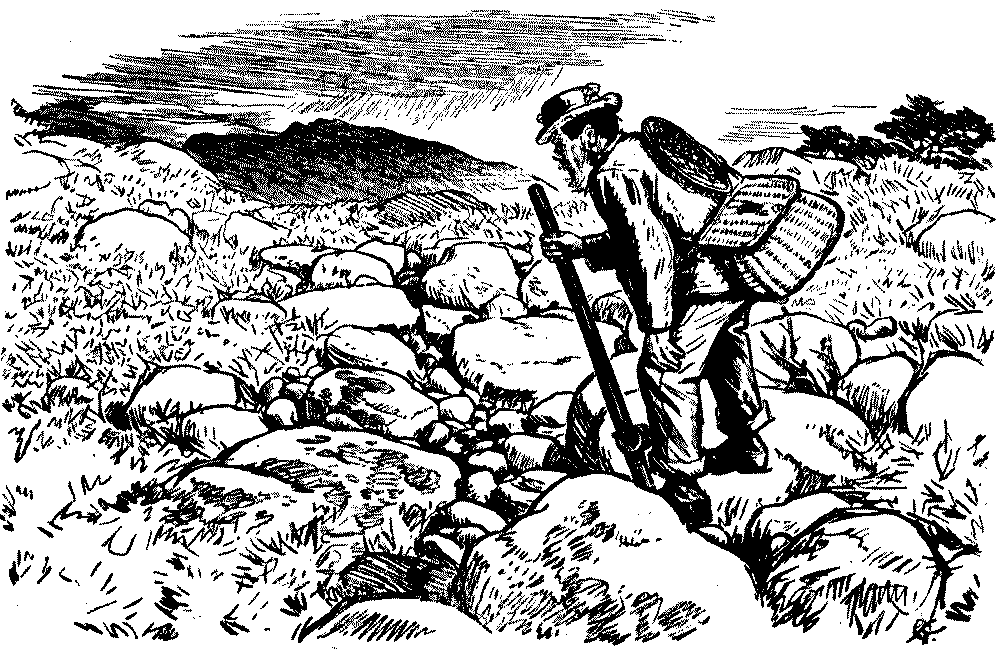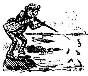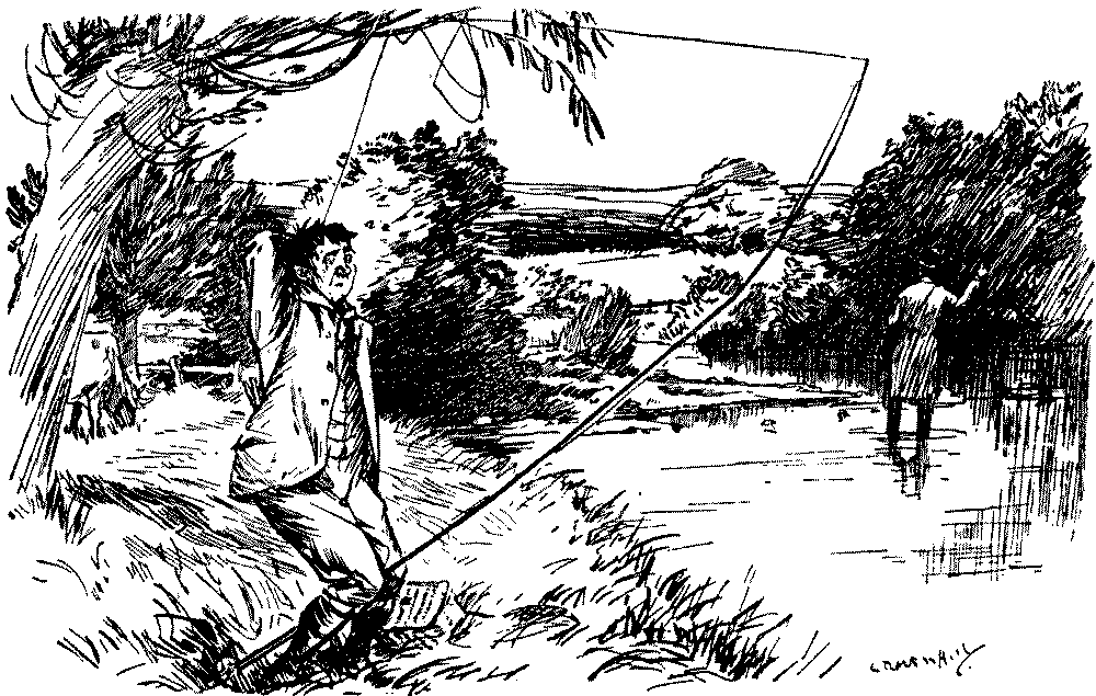 Stagger, stumble, violent bob forwards, recovery, trip up, and here one is in a sitting position in the bed of the stream. However, the high india-rubber breeks have kept the water out, except about a pailful, which gradually illustrates the equilibrium of fluids in the soles of one's stockings. However, I am on my feet again, and walking more gingerly, though to the spectator my movements suggest partial intoxication. That is because the bed of the stream is full of boulders, which one cannot see, owing to the darkness of the water. There was a fish rose near the opposite side. My heart is in my mouth. I wade in as far as I can, and make a tremendous swipe with the rod. A frantic tug behind, crash, there goes the top of the rod! I am caught up in the root of a pine-tree, high up on the bank at my back. No use in the language of imprecation. I waddle out, climb the bank, extricate the fly, get out a spare top, and to work again, more cautiously. Something wrong, the hook has caught in my coat, between my shoulders. I must get the coat off somehow, not an easy thing to do, on account of my india-rubber armour. It is off at last. I cut the hook out with a knife, making a big hole in the coat, and cast again. That was over him! I let the fly float[Pg 18] down, working it scientifically. No response. Perhaps better look at the fly. Just my luck, I have cracked it off!