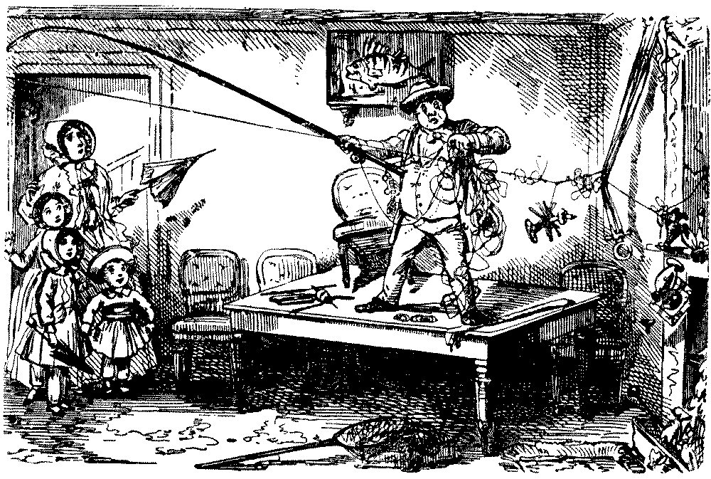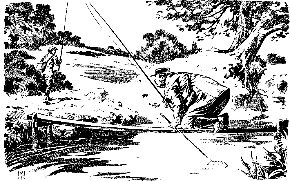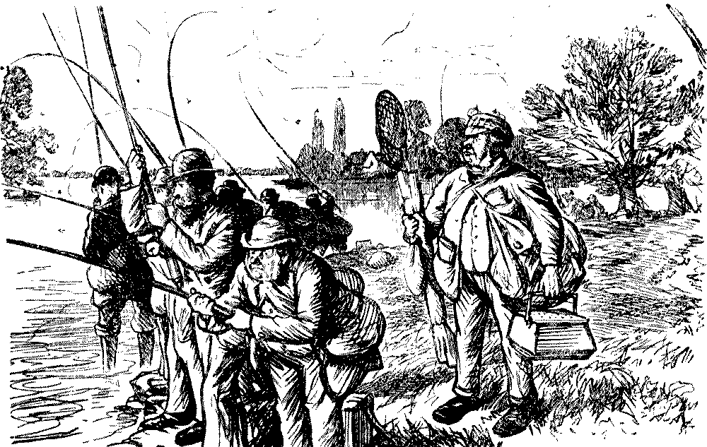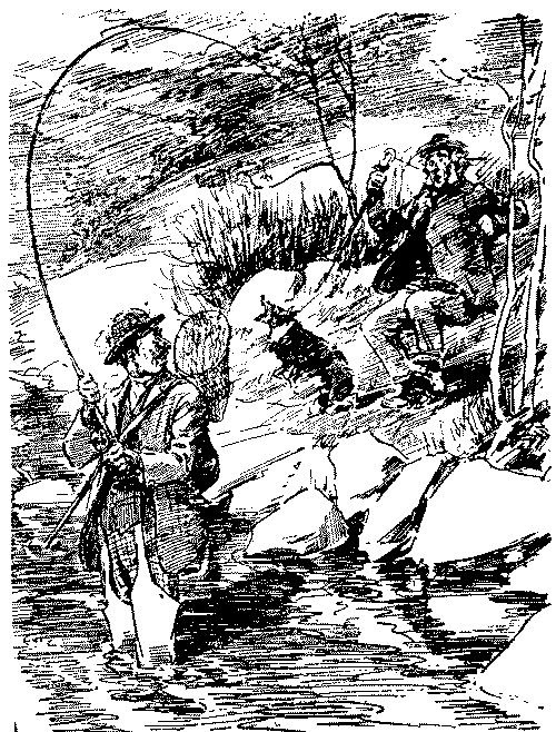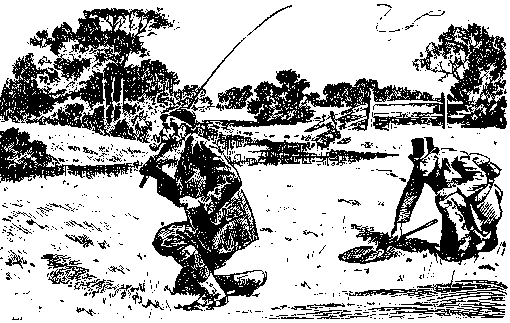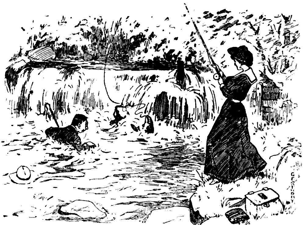 Party in Waders (on the shallower side, with nice trout on). "Now then, you idiot, bring me the net, can't you, or he'll be off in a second!"