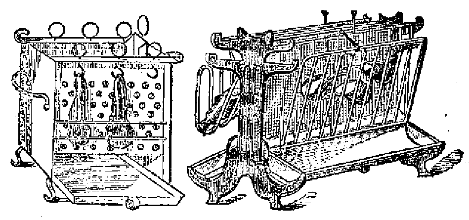 Grasera y parrillas diversas para asar chuletas ó pescados. Las parrillas cuyos diseños damos á continuacion son, sin contradiccion, las en que se hace la coccion en mejores condiciones.
