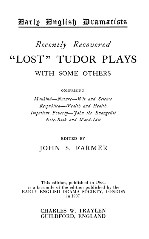 Title: Early English Dramatists--Recently Recovered "Lost" Tudor Plays with some others