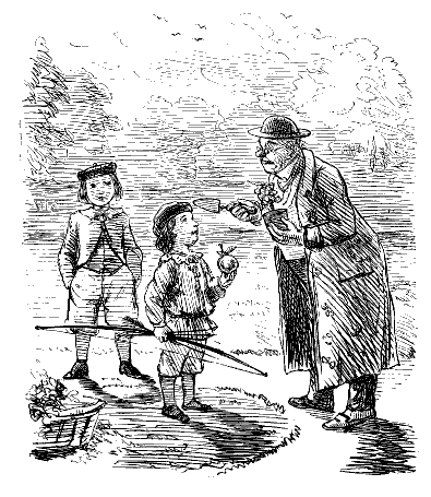 Alfred. "OH, IF YOU PLEASE, UNCLE, WE WANT TO PLAY AT BEING WILLIAM TELL; WILL YOU BE SO KIND AS TO STAND WITH THE APPLE ON YOUR HEAD?"