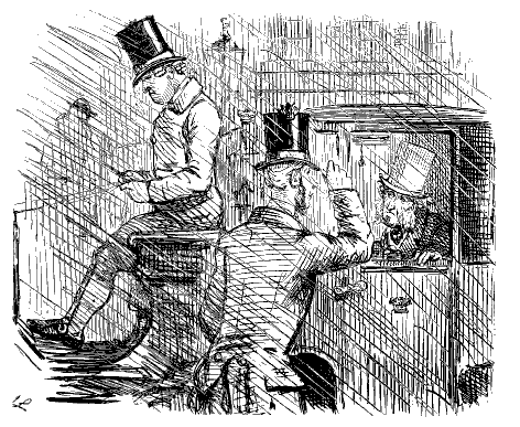 Swell (who has received Four Penn'orth of Coppers in Change). "HERE! BY JOVE, YOU KNOW LOOK HERE! HI! WHAT THE DEUCE!—I SAY—WHAT AM I TO DO WITH THESE HA'PENCE, YOU KNOW?"