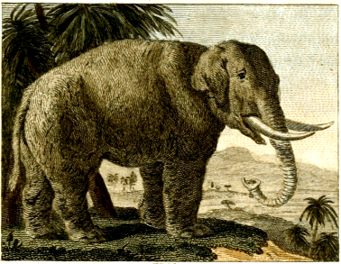 “If the elephant be vindictive he is no less grateful. A soldier at Pondicherry, who commonly gave one of these animals a certain measure of arrack every time he received his pay, having one day drank more than common, and seeing himself pursued by the guard, who wanted to conduct him to prison, took refuge under the elephant, and there fell asleep. In vain did the guard attempt to draw him out from this asylum, the elephant firmly defending him with his trunk. The next day, when the soldier became sober, he was struck with terror to find himself under an animal of such enormous bulk. The elephant, who no doubt perceived his consternation, caressed [309] him with his trunk, and made him understand that he might depart freely.
