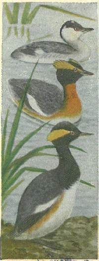 In winter this Grebe is one of the plainest in its dress of gray and white, but summer brings a great change, making it one of the most attractive, with its black, puffy head, and buffy white ear tufts, the front of the neck a rich chestnut color. Their food consists almost wholly of small fish.