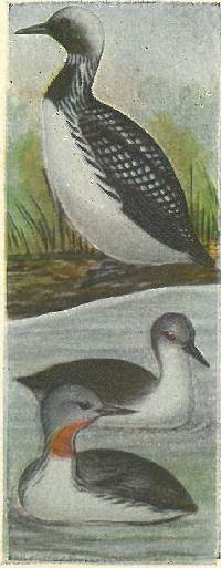 The smallest of the Loon family. The back and head are gray, there is a large patch of chestnut on the fore-neck; under parts white. Owing to the straight top to the upper mandible the bill has a slightly up-turned appearance.