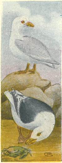This large gull, with its almost pure white head and neck and slaty colored back, is one of the prettiest. They often nest in colonies with other gulls, building their small mounds of seaweed on the higher parts of the islands.