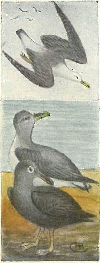 This bird is the most southerly distributed of any of the large Gulls, and can be seen about the harbors of California at all seasons of the year. They are great thieves, robbing the Murres and Terns wherever eggs are left unprotected, and are the greatest enemy that the Murres have to contend with.