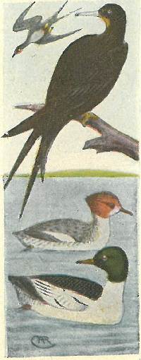 These birds are slender and graceful in form and flight, but are the real pirates of bird life, especially among the terns and gulls. This species has two color phases regardless of sex or age. In the light plumage the top of the head is black, rest of the bird brownish. Easily identified by the lengthened central tail-feathers.