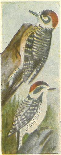 Their nest is usually placed in a cavity of some tree at quite an elevation from the ground, being lined with strips of bark and feathers. They lay from four to six white eggs, thickly spotted with shades of brown (.60 × .50).
