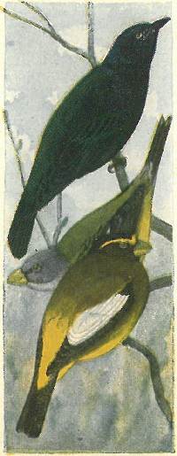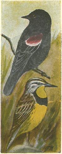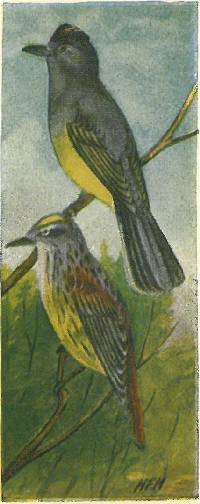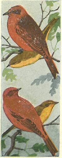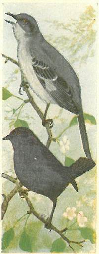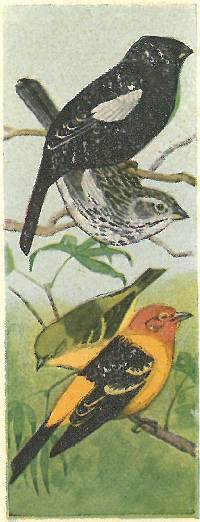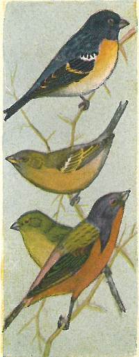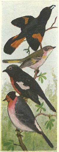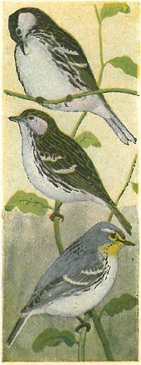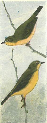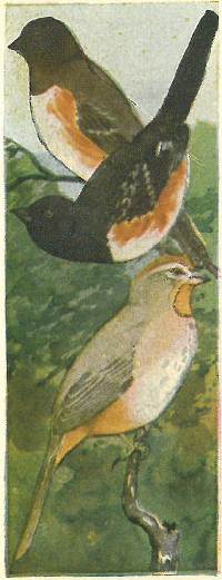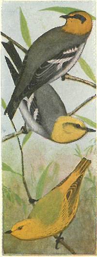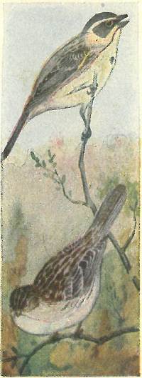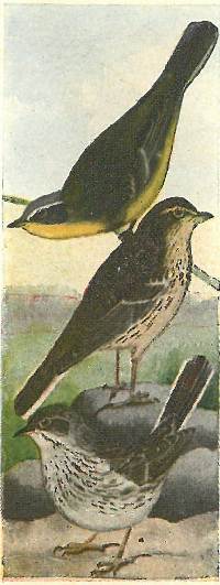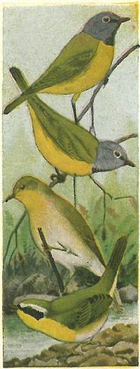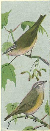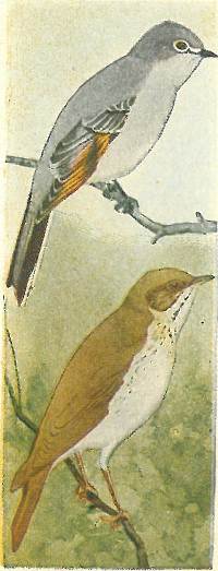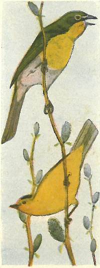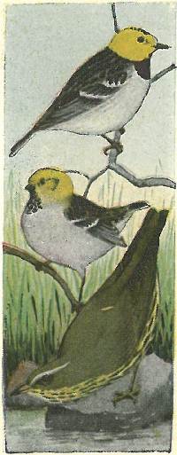 Range.—Alaska to Mexico, breeding in its extreme northern range. These birds are noted for their sweet and musical song, which may be heard from the swamps and thickets in which they make their home. They nest either on or near the ground, building it of shreds of vines, leaves and grasses. Four bluish green eggs, unmarked, are usually laid (.85 × .65).