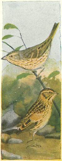 Range.—From British Columbia northward, and winters south to Mexico. Their nests are placed on or near the ground in a stump or tussock, usually in very moist places, and are composed largely of leaves and mosses. Their three or four eggs are a bluish green, spotted and blotched with reddish brown (.88 × .64).