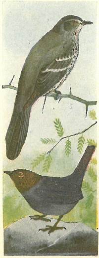Range.—Southern and Lower California to Mexico. This is the lightest in color of any of the family, and has taken on the color of the sand of the low hot deserts in which it lives. Where it is so hot and dry that even the cactus and thornbush are stunted in their growth, where the ground is covered with the small varieties of cacti, with spines like needles. In such a place one cannot imagine that a bird would be as full of song as in a shaded piece of woodland, yet this bird has the same qualifications, and morning and night his voice may be heard, pouring out as rich a song as his brother of the north. Their nest, composed of twigs, weeds and lined with grass, is usually very bulky, and placed in low mesquite trees or cactus. The eggs are lighter in color than above, and with fewer and finer spots of brown (1.10 × .75).