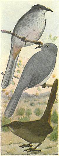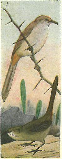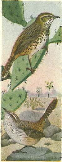 Range.—Southern part of California, to Texas, and north to Nevada and Utah. They are the largest of the Wrens, and look the least like that family of any of them. They are a common bird in the desert lands, where the cactus abounds, but lacks the sweet song of some of the smaller members of the family. Their nests are bulky, ball-shaped structures, made up of sticks, moss, grass, and lined with feathers. There is an opening on the side for an entrance, and it is usually placed in a thorn bush or cactus. Their four to seven eggs are creamy white, dotted thickly with chestnut (.95 × .65).