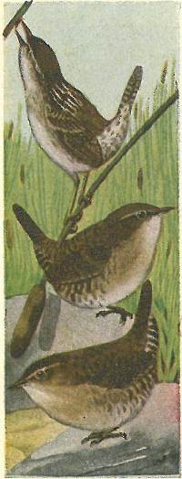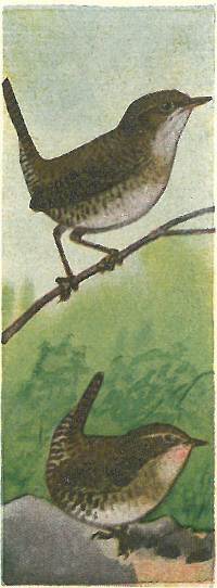 Range.—From Alaska to New Mexico, through North America. This is the smallest of the family, and is also one of the most quiet in song. They are active little fellows, just a bunch of feathers, with a short stub of a tail up over their backs when observed, and getting about the brush heaps and stone walls like little mice. They nest in walls or crevices of rocks, and stumps, building of twigs, leaves, grass and feathers, in which usually six or seven eggs, creamy white, finely specked with brown, are laid (.60 × .48).