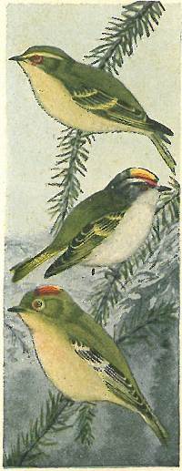 Range.—Alaska to southern California, on the Pacific coast. These little birds are found commonly in company with small flocks of the Chickadee, and like them may be seen hanging on the under side of the outer ends of the coniferous trees in search of their insect food. They nest in the northern part of their range, building large, comfortable-looking structures of needles from the pines, strips of vines and grass, nicely lined with feathers. Four to eight eggs, dull white, spotted with brown and lilac (.55 × .42).