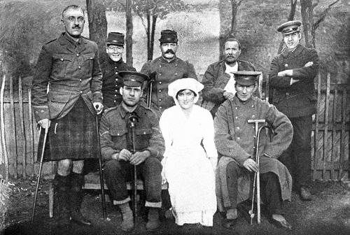 As I made my way slowly along the platform I saw several of these poor fellows standing about on crutches, one or two of whom I had met before at Cambrai. They were very cheery, and it was cheering to see them and hear the familiar query, "Are we downhearted?" with its answering roar from the train-load of cripples. But the thin pale faces and ragged clothes bore witness to the misery from which they, the lucky ones, were now to be released.