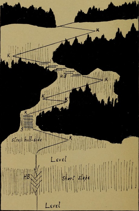 On very steep ground the ski-runner has a still greater advantage, for here the narrowness of the ski allows him to move across the steepest snow slopes with little or no discomfort to his ankles, while on a steep slope the man on racquets is practically helpless, for, on account of[3] their shape, it is only with the utmost difficulty, if at all, that he can move either up, down, or across the hill.