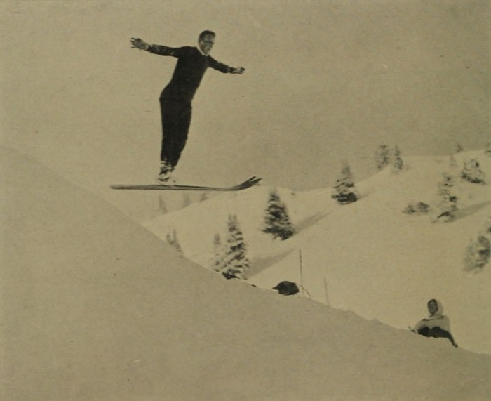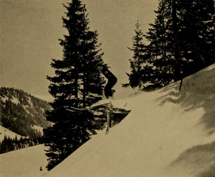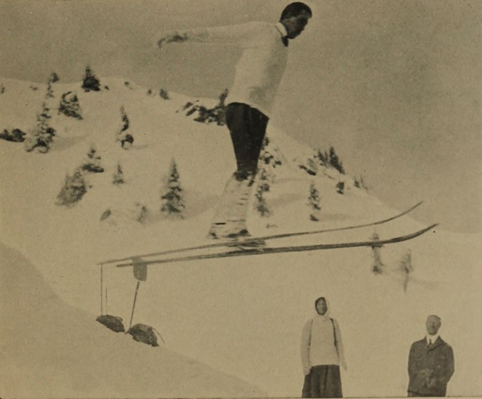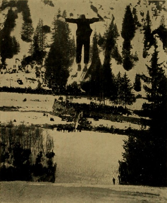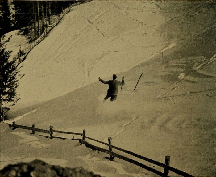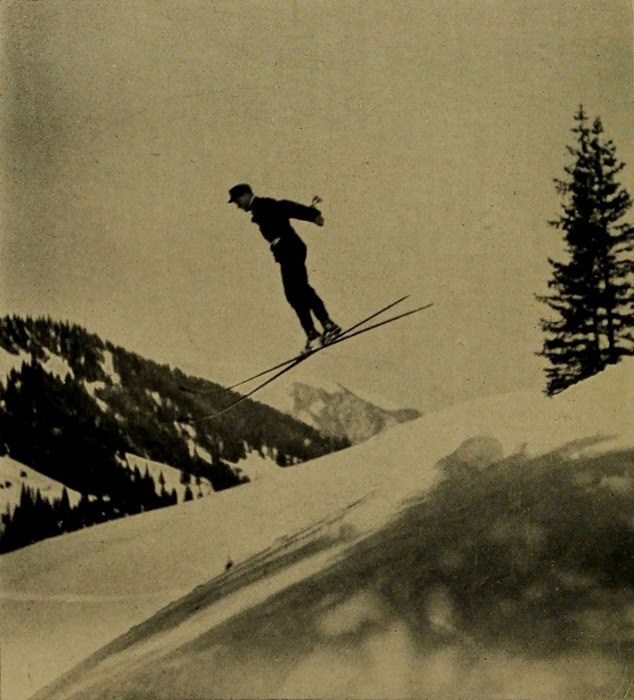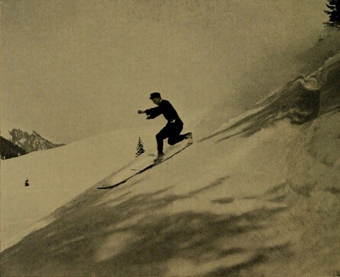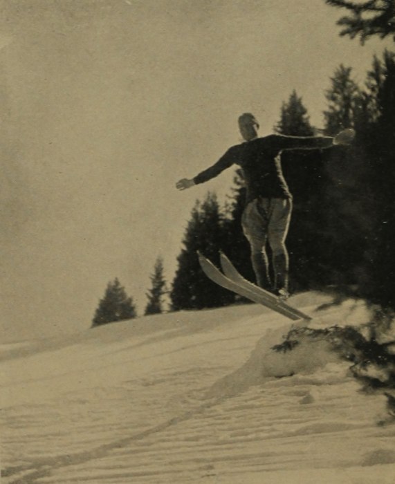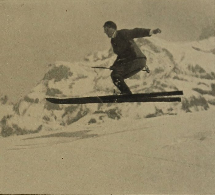 With regard to the possibilities of ski-running considered purely as a sport, it may be said that a good runner, descending a steep hill where the ground is open, will often cover a considerable distance at an average rate of 45 miles an hour: that when moving at half that speed he can thread his way among obstacles or stop suddenly; and that the present record for a jump on skis is about 154 feet. I need hardly say, therefore, that the opportunities afforded by the sport for the exercise not only of the runner’s nerve, but of his skill and judgment are almost unlimited.