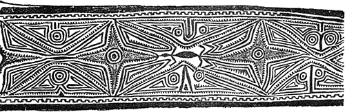 So, too, in studying the arts of design. The artistic expression of a highly civilised community is a very complex matter, and its complete unravelment would be an exceedingly difficult and perhaps impossible task. In order to gain some insight into the principles which underlie the evolution of decorative art, it is necessary to confine one’s attention to less specialised conditions; the less the complication, the greater the facility for a comprehensive survey. In order, therefore, to understand civilised art we must study barbaric art, and to elucidate this savage art must be investigated. Of course it must be understood that no hard and fast line can be drawn between any two of these stages[3] of culture; I employ them merely as convenient general terms. These are the reasons why I shall confine myself very largely to the decorative art of savage peoples.