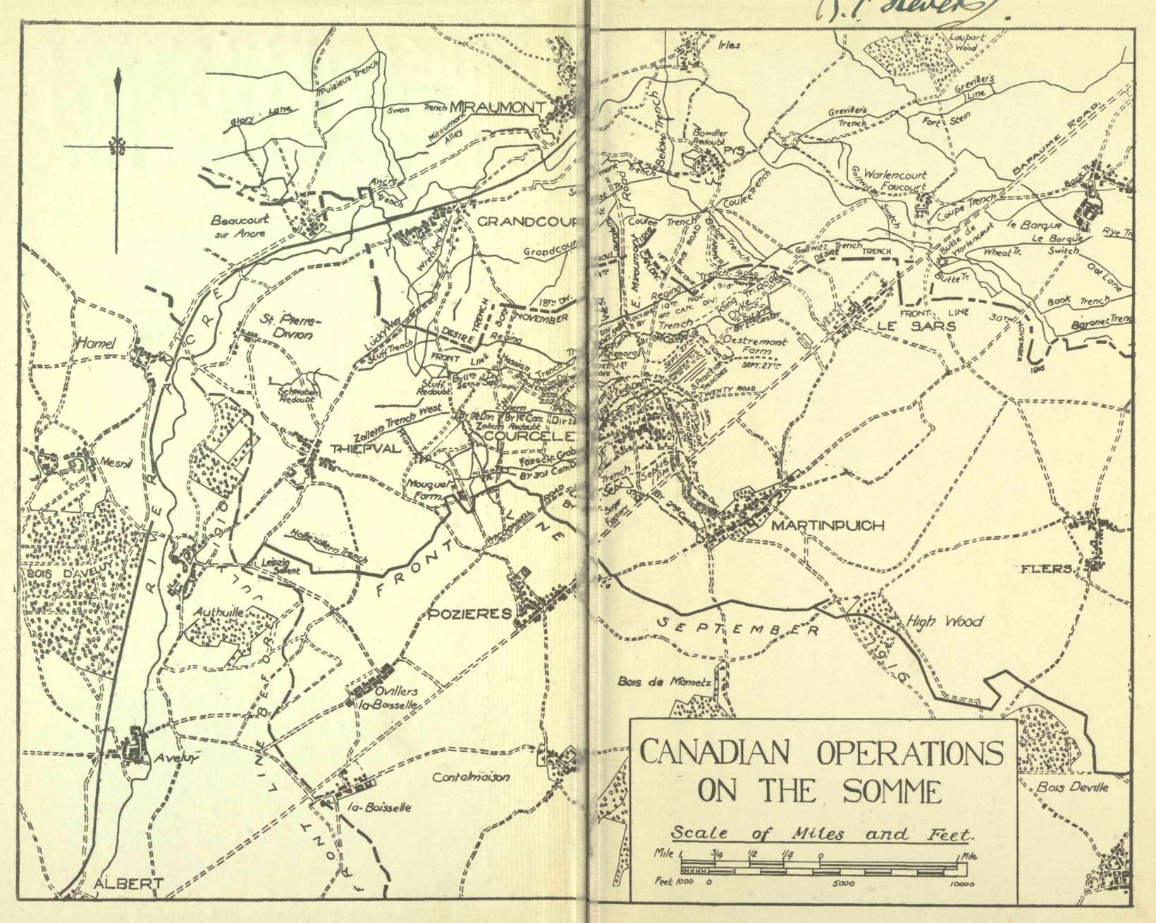 It is around the part played by the Canadian Forces in the gigantic and long-drawn-out struggle known as "the Battle of the Somme" that the interest of this third volume of our records must centre. The operations which began, on July 1st, 1916, with the ponderous thrusts of the British and French Armies from before Albert and Bray, and ended with the capture of Bapaume and Peronne on March 17th and 18th, 1917, constituted, according to the nomenclature of war before these days of Armageddon, not one battle, indeed, but a campaign of many great battles. In this war, however, all is on a scale so colossal that standards and terms of comparison have to be enlarged in due proportion. All that unparalleled outpouring of agony and splendour, of sacrifice and endurance, of heroism and destruction, which the Germans have so poignantly—and significantly—designated as "the blood-baths of the Somme," may be taken as one battle, a battle in whose vast rhythm the old values of hours and days are supplanted by weeks and months. Yet never before in the world's history was there a battle in which minutes have been held so priceless, the seconds themselves so reckoned upon with meticulous precision. To present an adequate picture of the battle as a whole, or even of the specific part played in it by this or that particular corps, is a task that will tax the powers of the inspired historian, viewing the great subject at such a distance that he can see it as a whole and in its true perspective. He will need to be a new Thucydides, equipped, not only with grasp and vision, but also with mastery of the magic of words. And even so, the story will never be half told. Men will continue digging into the records and unofficial accounts as an inexhaustible mine, forever discovering new jewels of wonder and terror and pity. The utmost that can be attempted in this unpretending narrative is to set down the salient facts as to the achievements of our own Divisions, with such detail as can be sifted out, more or less at hazard, while the dust of the stupendous conflict is still in the air.