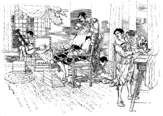 DAY came, and we all started to action. I was as well acquainted with them already as if we had been one mother’s children; for there is ever an easiness and sweetness in things evil. It was very pleasant to see one put on his shirt at ten several times, because it consisted of as many several clouts, and say a prayer at every one, like a priest that is vesting to go to the altar. One could not find the way into his breeches; another called out for help to put on his doublet, for none of them knew the right side from the wrong, or the head from the heels. When this was over, which afforded no little pleasure, they all laid hold of their needles and thread, and it was darn, stitch, and patch. One fixed an arm against a wall, to draw together the rents in a sleeve; another kneeled down, to botch up the holes in his hose; another clapped his head betwixt his legs, to come at a breach upon his buttocks. Bosco[19] never painted such variety of strange figures as I saw there; they botched, and the old woman supplied them with materials, rags and clouts of all the colours of the rainbow, which she had picked up on Saturday night.