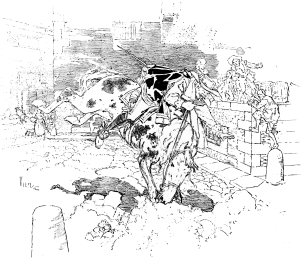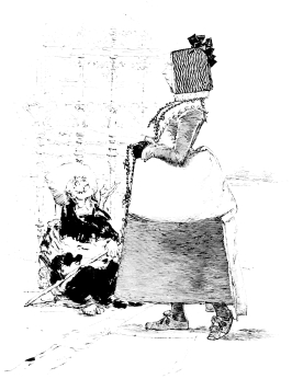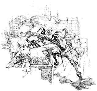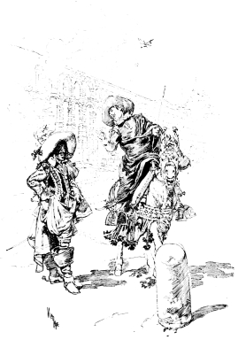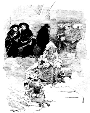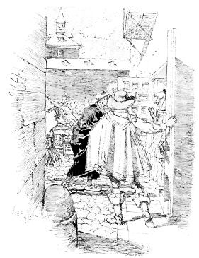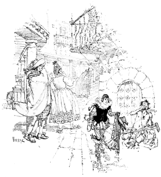 Vierge’s first edition of this book was published in Paris in 1882, by Bonhoure, and the drawings not only made his own name famous throughout the entire artistic world, but renewed the popularity of Quevedo. The book—and when I speak of it I refer to the illustrations and not to the letter-press—was the most brilliant, the most daring, the most original which had ever appeared. From the head-piece of the first chapter nearly to the end, almost every page contained a perfect picture which amazed all who studied it, and delighted all who could appreciate it. These exquisite little drawings displayed a knowledge of form, of action, of light and shade, of architecture, expressed with a brilliancy of handling which has never been surpassed. To make such a statement is to challenge criticism. But if there have been any more artistic drawings, or engravings of drawings, produced from the time of Dürer or Bellini, Rembrandt or of Piranesi, I have yet to find them, though I have gone in search of them through the chief Museums and Galleries of Europe. In comparison with Vierge, Dürer knows nothing of light and shade, Bellini and Vandyke and Holbein are heavy and laboured in their handling, while Piranesi and Canaletto have but an historical interest. It is true that to-day in many ways by many men Vierge is nearly approached, but he has been the inspirer and the master of them all.