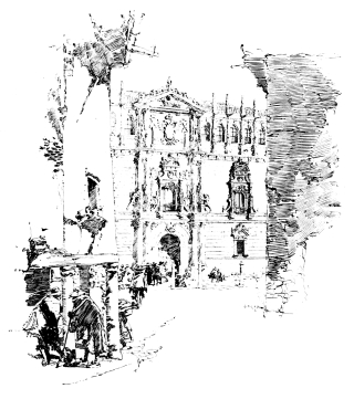 It is most evident in his power of expressing many facts with the fewest possible lines. Each one of these lines is put down with the thought of the engraver for ever in his mind. This, however, does not mean that he is less free in his handling. It merely implies his complete command of his materials. The art of leaving out, and yet conveying the right impression, probably is the most difficult in the world. Like all art, which is most subtle, it appears ridiculously easy. Every line is drawn with the utmost care—a care so great that it is not apparent. The figures in the little pictures are worked out with a thorough knowledge of anatomy. The architecture and landscapes, and especially one or two drawings of mountains, have been studied and rendered in marvellous fashion. All these pictures are filled with the sunlight and atmosphere of the south; and all look so simple and so slight that anyone would think he could almost do them himself. Possibly he could—almost. For the boundary between good work and bad is nearly imperceptible; in fact, it is quite so except to a few artists. And it is really only to those few artists that a work of art does truly appeal in its entirety.
